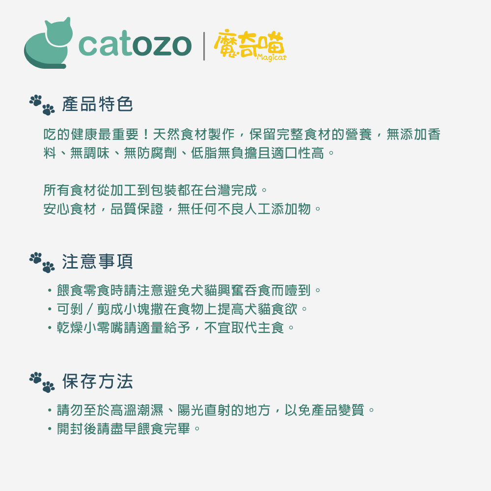 冷凍乾燥技術滅菌,天然食材製作,保留完整食材的營養。無添加香料、無調味、無防腐劑、低脂無負擔且適口性高,貓咪、狗狗都喜歡的乾燥小零嘴。