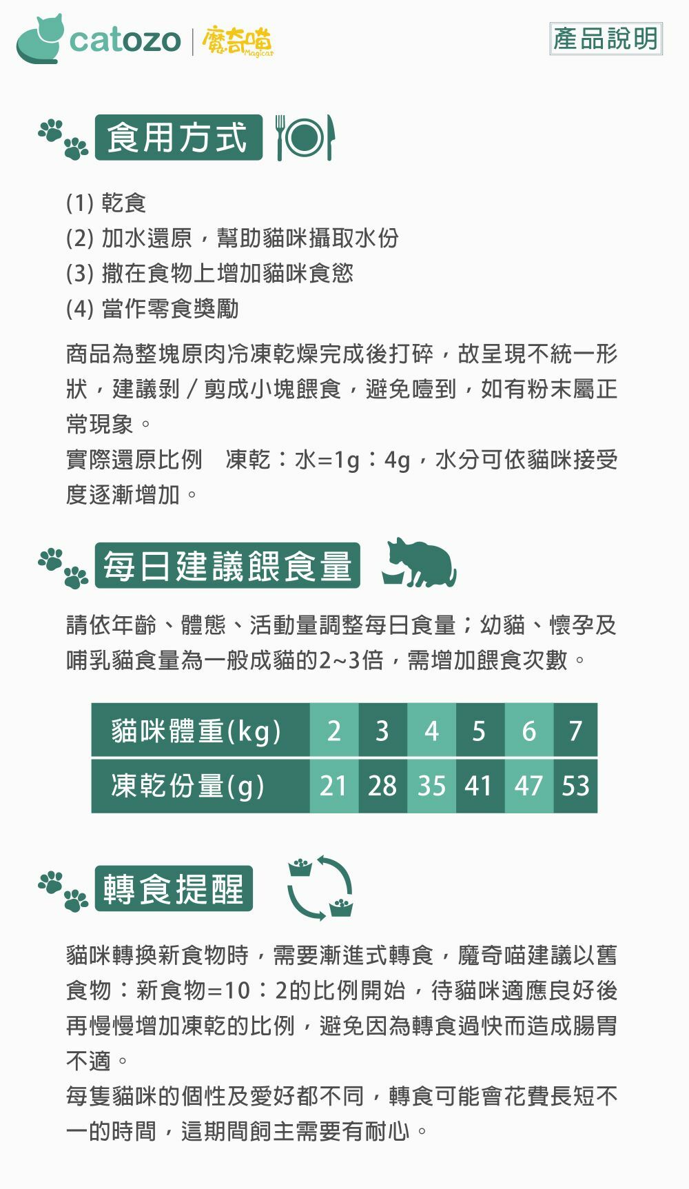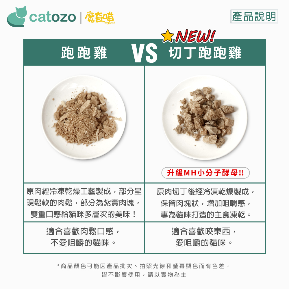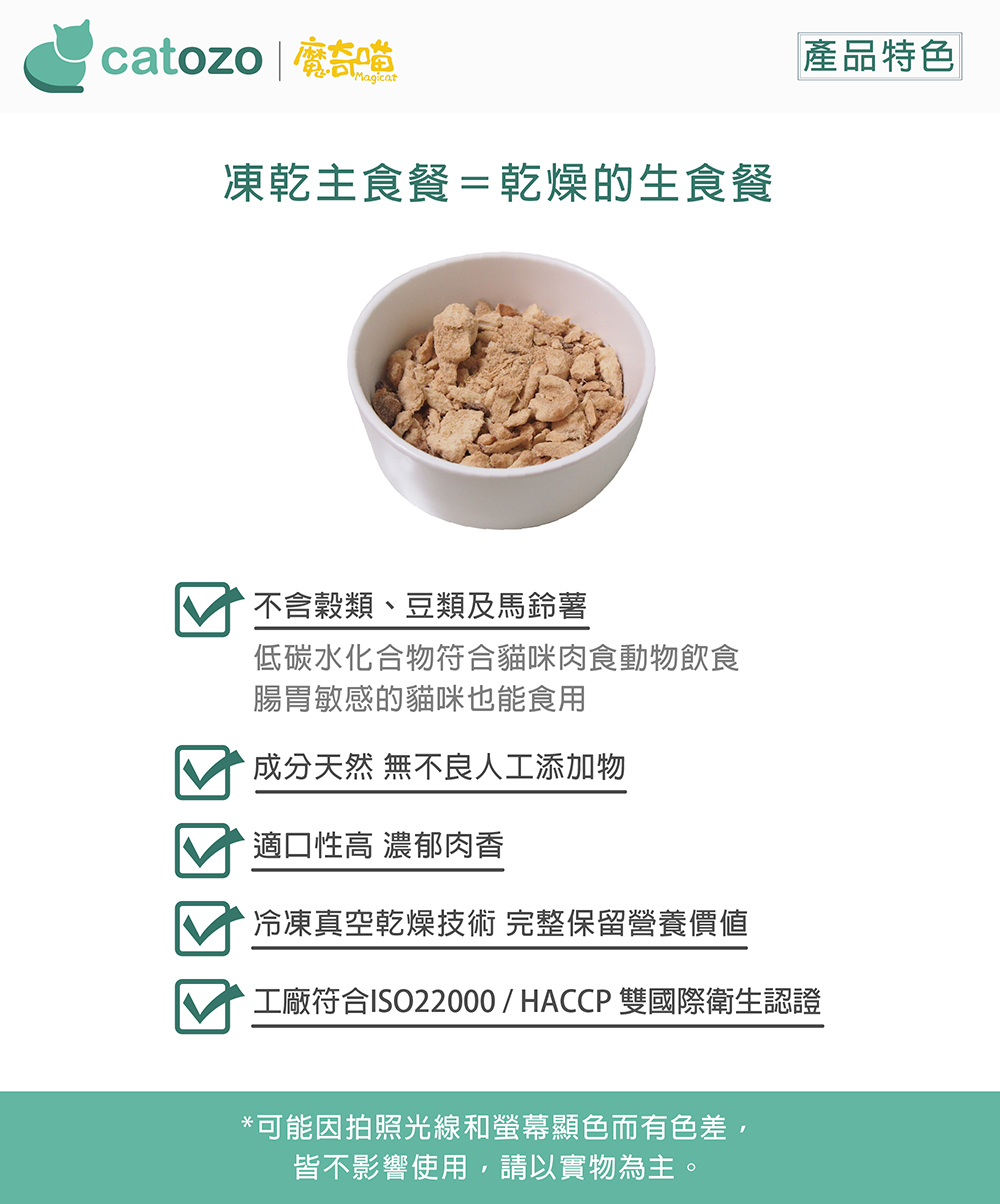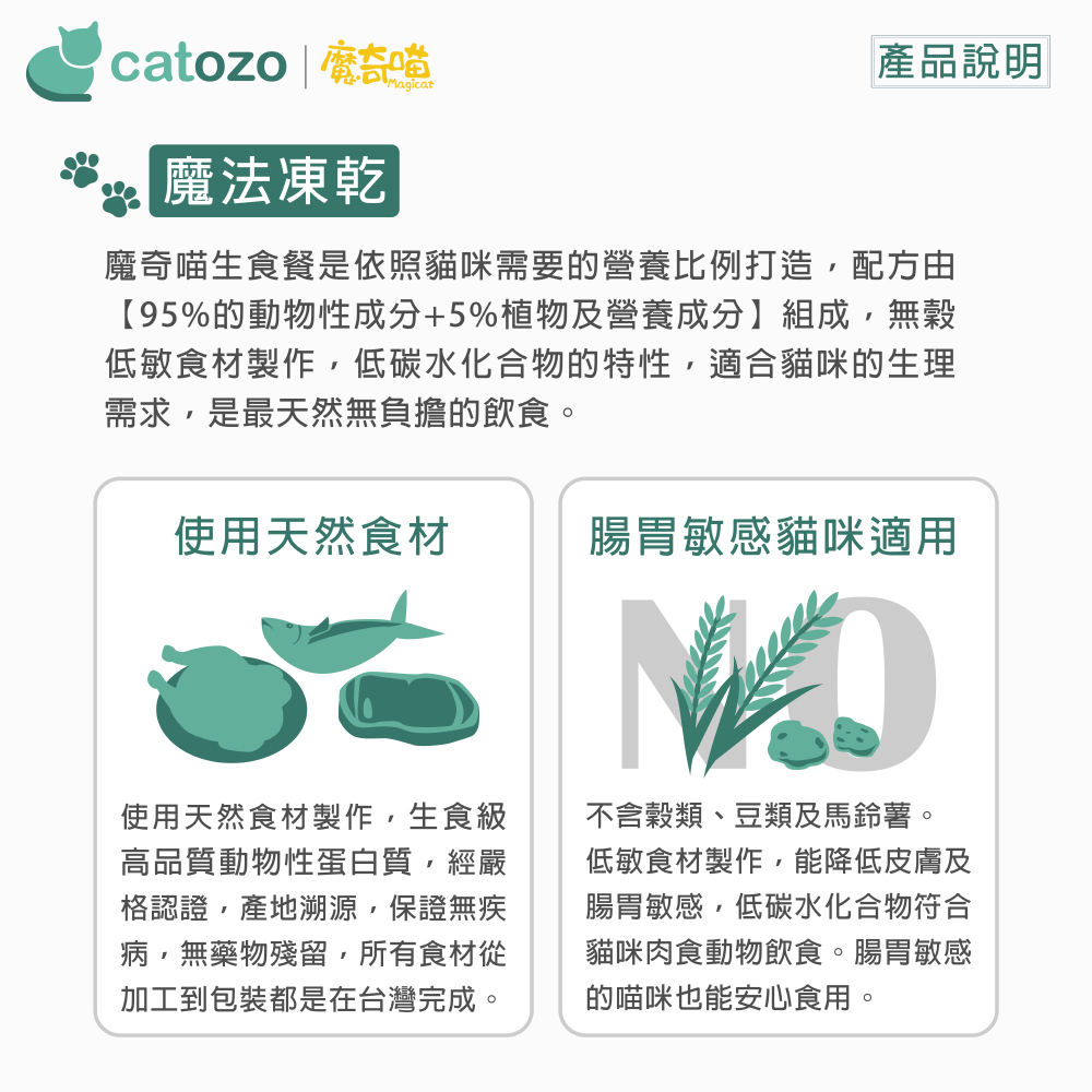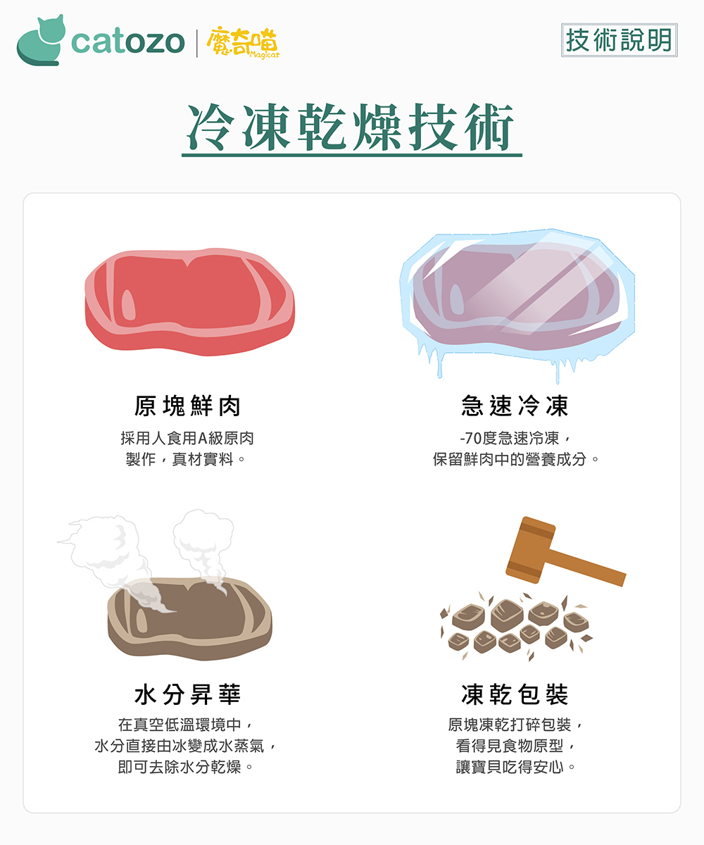 新鮮食材的營養在高溫烹煮過程的中會大幅流失,為了使貓咪可以更輕鬆簡單的享受生食,魔奇喵研發魔法凍乾是[乾燥的生食餐],採用冷凍真空乾燥技術製作,而非傳統高溫烘乾方式,可以達到與生食同等的營養並具有常溫保存的方便性。