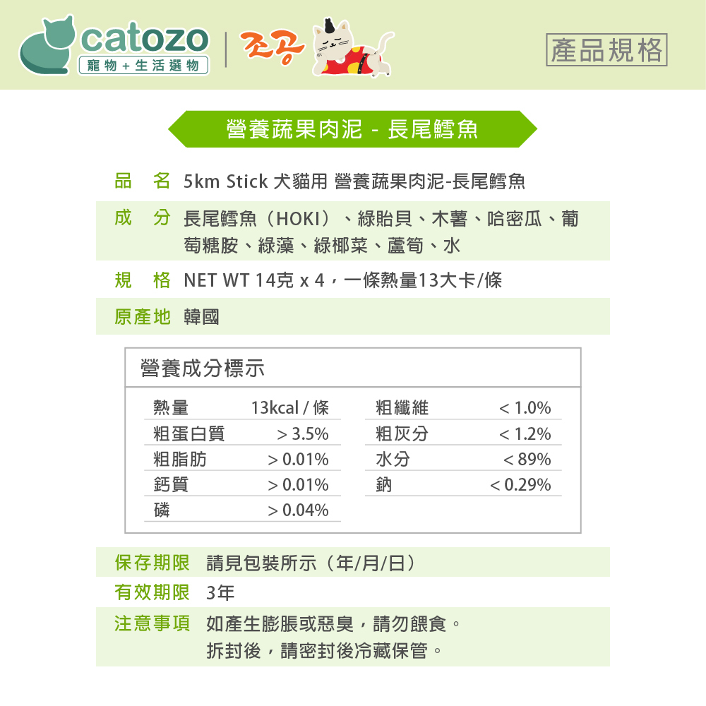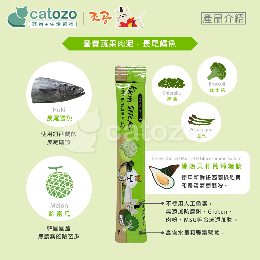 韓國朝貢// 5km Stick 犬貓用 營養蔬果肉泥-哈密瓜貽貝 長尾鱈魚(淺綠)